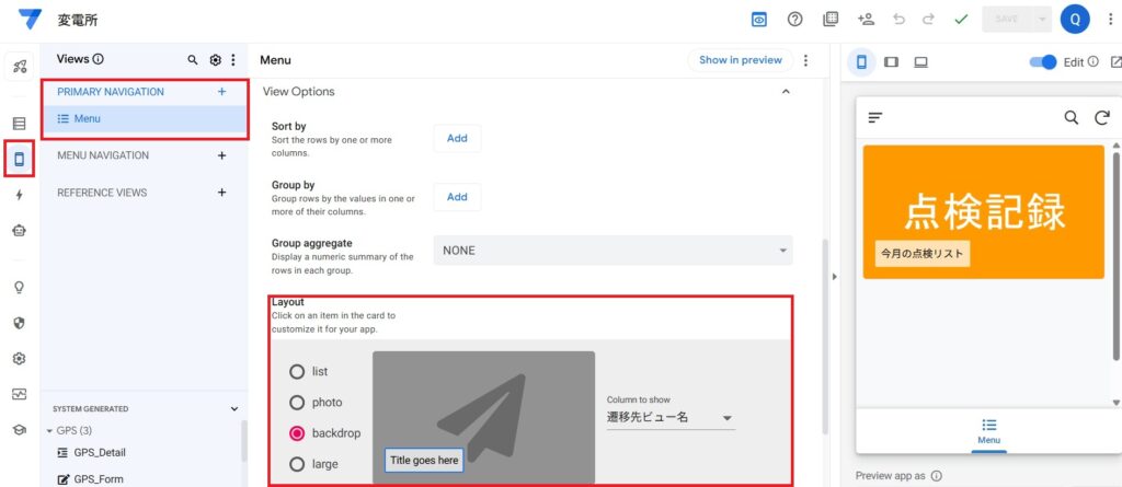 ・Layout→backdrop→Title goes here Column to show 遷移先ビュー名にする。
