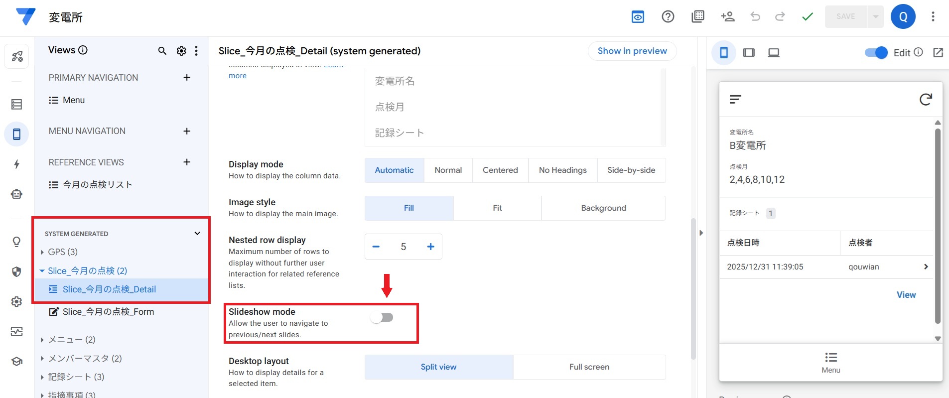Slice_今月の点検_Detailが出現!そこで Slideshow modeをOFF にして「>」を完全消去。