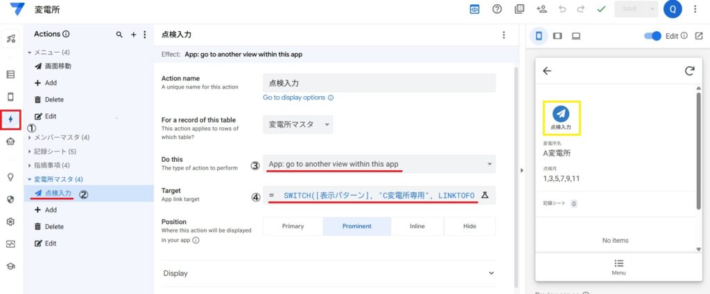 ①Actions→②変電所マスタ 点検入力を追加→③Do this 写真のように設定