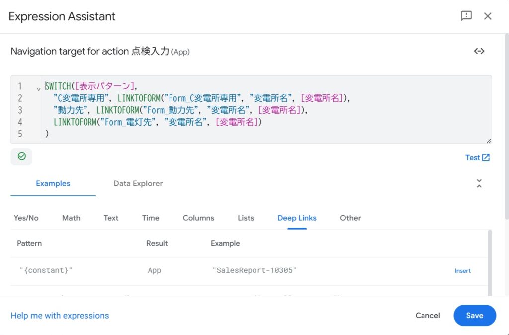 ④Target 下記の式を入力する。この式は、スプレッドシート→変電所マスタ→表示パターンごとに、入力フォームを表示する。