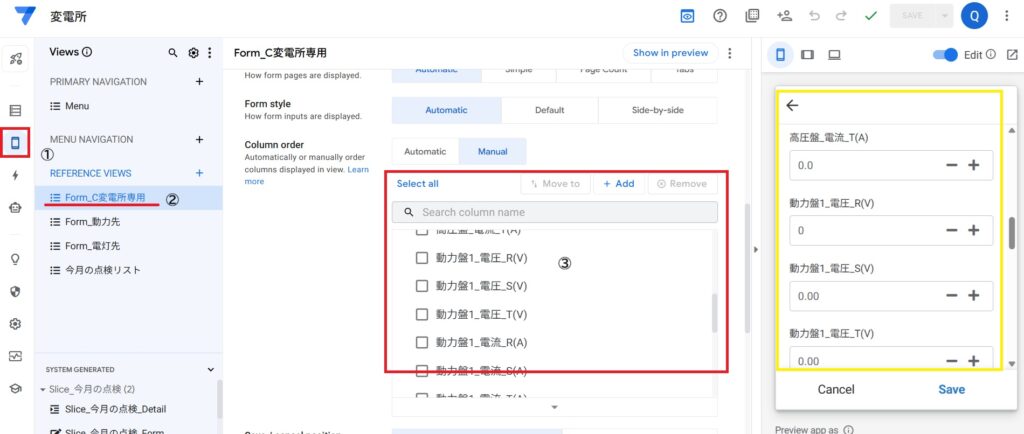 ①Views→②Reference Views C変電所専用を追加→③Column order 入力したい、表示したい順番に選択する。この場合(C変電所)は、「第1弾」シート設計編で示した通り、設置設備 高圧盤,動力盤1,電灯盤1 表示パターン C変電所専用。For this dataには、Slice_C変電所専用を設定を忘れずに。