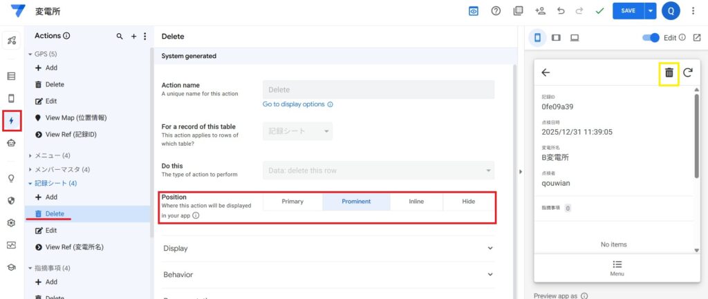 「点検ボタン」があるのに、AppSheet標準の「ゴミ箱」が並んでいると、初心者は必ず迷う。