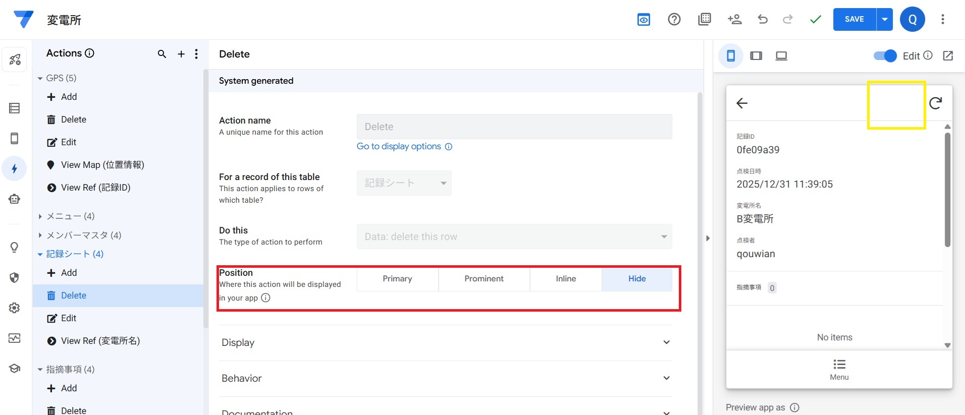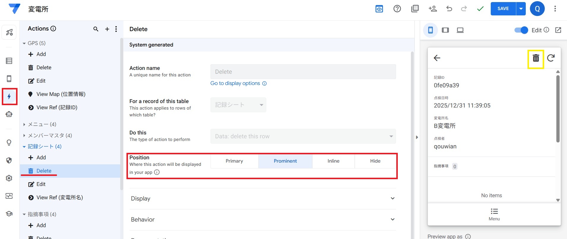・設定場所: Actions > 対象テーブル(記録シートなど)の Delete を選択