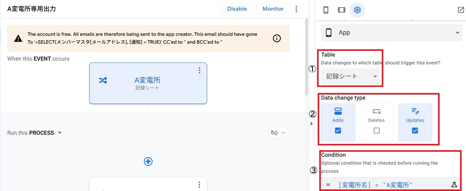 ③ Condition: A変電所専用フォーマットなので、[変電所名] = "A変電所"と書く