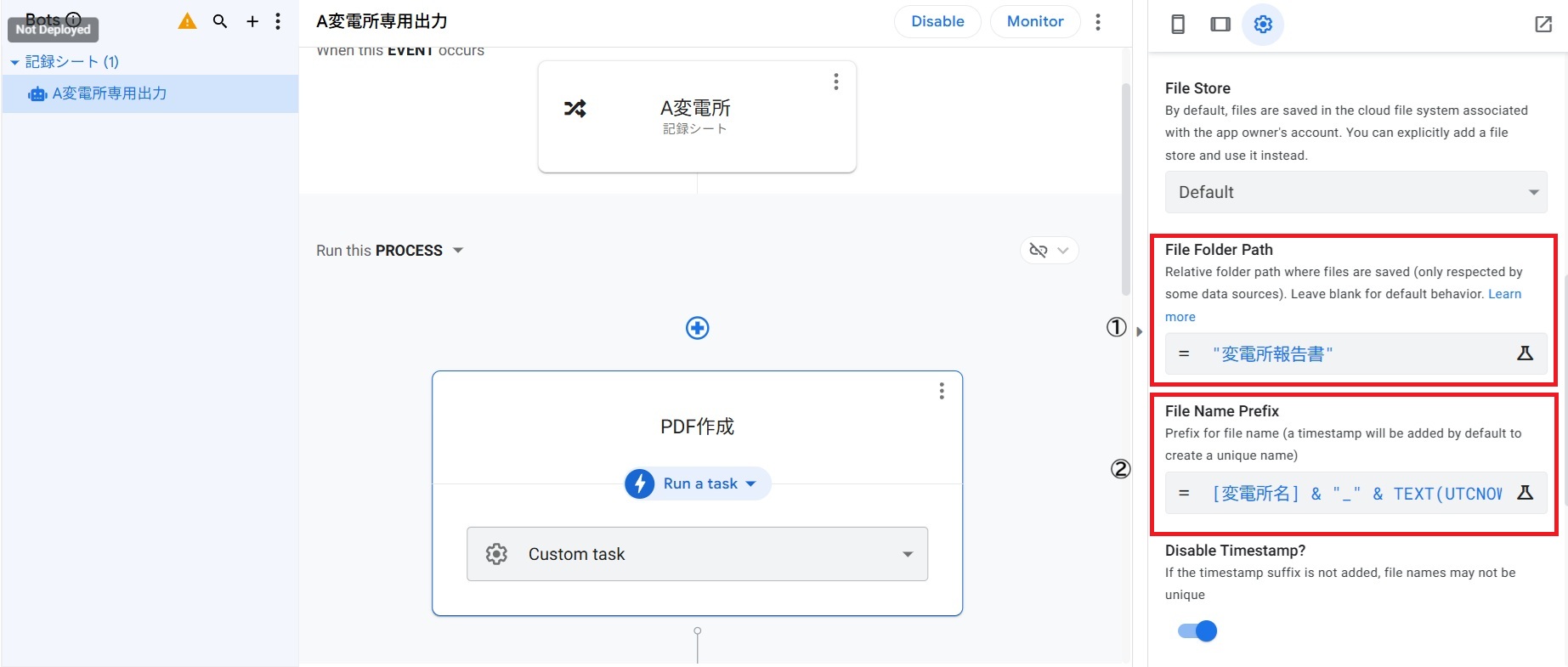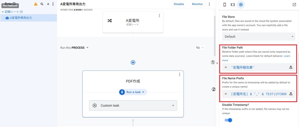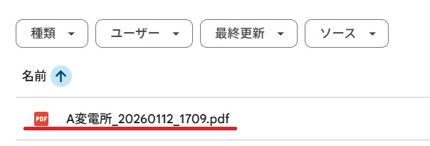 右側の説明 正しく動作すれば、”A変電所_20260112_1709.pdf”のファイル名が作成される
