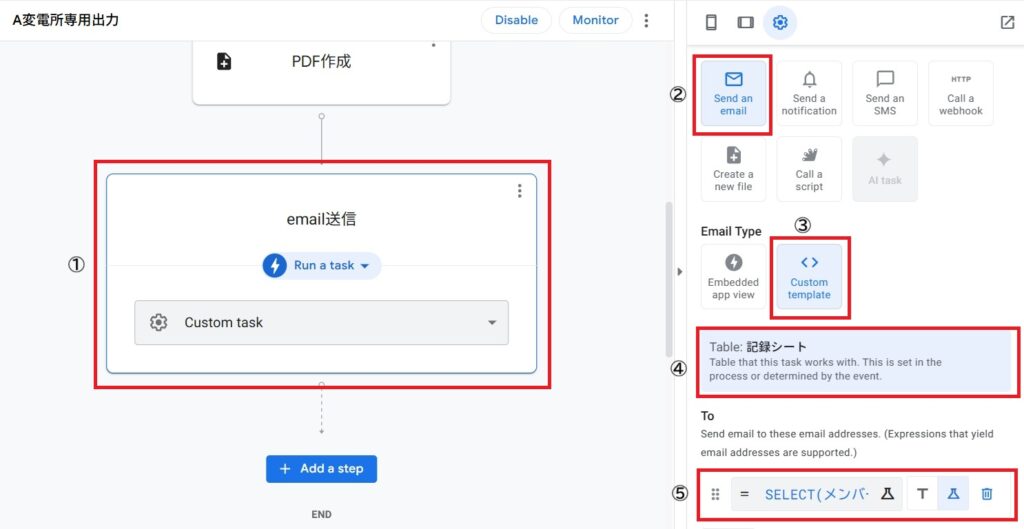 ② Send an emailを選択 ③ Custom templeteを選択
