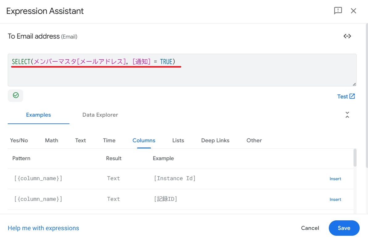 右側の説明 ① Tableを選択 今回の場合”記録シート”を選択