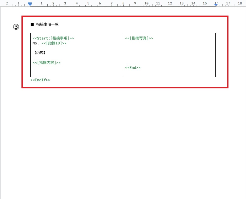 ②・③条件分岐: 指摘事項(写真)がある時だけページを表示させる <<If: COUNT([指摘事項]) > 0>> およびと新しいドキュメントを追加し、③の式を入力。